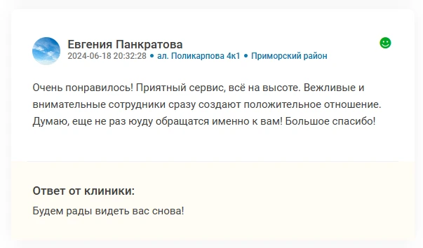 Важной составляющей портала является блок с отзывами, которые оставляют наши посетители. Мы предлагаем наладить с ними контакт, оставляя официальные комментарии от лица компании. Видя вашу активность, клиенты, которые выбирают клинику по отзывам и рейтингу, с большей охотой обратятся именно к вам. Вежливый ответ и внимание к клиенту скрасит даже негативный комментарий, превращая его в очередной плюс для репутации компании.